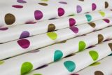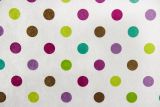 Bubblegum Spring is colorful polka dots on white faux suede that is also a microfiber which means easy to clean.