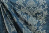 Cosmopolitan Indigo is a beautiful woven 110-inch extra-wide damask pattern against an antique wallpaper style background.