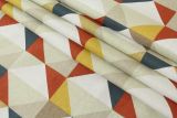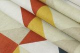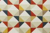 Covington Denmark Autumn is a 100% cotton fabric with a geometric pattern in colors including rust, blue, white, taupe and gold.