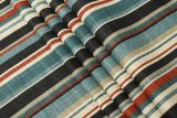 Covington Pauline Mardi Gras 150 is a cotton linen blend fabric with a stripe pattern in colors including blue, rust, black and gray