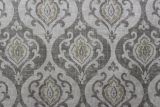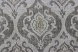 Covington's Suri Raffia fabric is of a printed damask printed on a cotton linen slubby cloth. The fabric has gray/taupe print with gold accent.