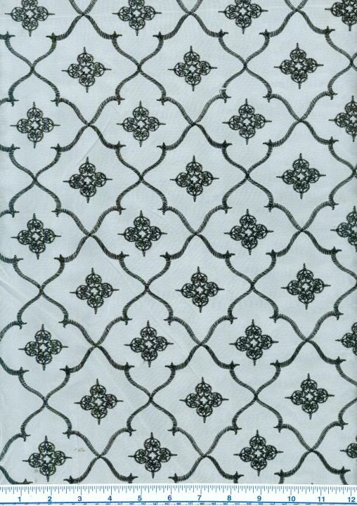 Embroidered black lattice on white sheer. Perfect for window treatments, dust ruffles, and table-toppers.