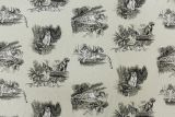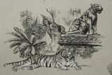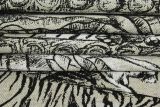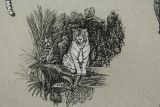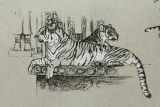 Malaise Black fabric features a print of tigers in various poses amongst trees and statues in black and white against a stone color background.