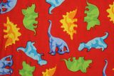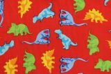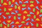 Dinosaur Red is a 45" 100% cotton fabric with a print of dinosaurs in different colors against a vibrant red background. Great for face masks!