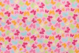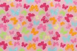 Pretty Wings Pink is a 100% cotton fabric with a print of butterflies in colors including pink, blue, green and yellow against a pink background. Great for face masks!