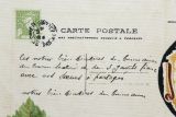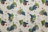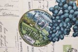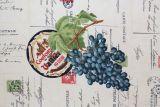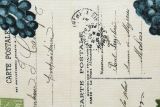 Cheese Fromages C/3 is a beautiful print of various French cheese labels and grapes on vines with green leaves, as well as French postcards.