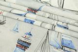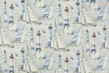 In the Breeze Sail is a 100% cotton fabric with a nautical print of lighthouses and sailboats. Made in the USA.