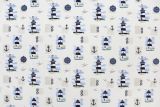 Lighthouse Scene Bleu is a beautiful 100% cotton fabric with a nautical themed pattern featuring lighthouses, anchors, rope, birds and the beach.
