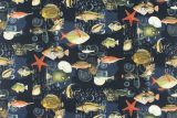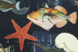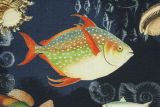 Maldives Marine is a 100% cotton fabric with a nautical theme print of multiple species of fish in colors including, blue, green, orange and black.