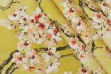Covington Sakura Curry is a print of pink and red flowers on branches against a yellow background.