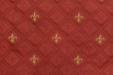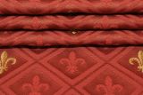 Soft woven jacquard is a beautiful fleur de lis pattern fabric in gold and red, against a red background.
