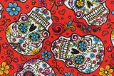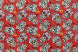 Folkloric Skulls is a colorful 100% cotton day of the dead themed fabric with skulls adorned with colorful flowers against a red background.Great for face masks!