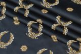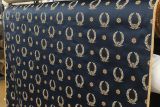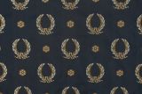 Utrillo Imperial Wreath is a jacquard fabric with golden wreaths against a classical navy blue background. This is woven with Egyptian cotton and Rayon to create a beautiful hand. Woven in Belgium.