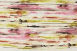 Kiko Sunset is linen blend fabric with a printed contemporary design in colors including pink, green, white and gray.