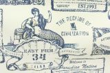 Mermaids Call Evening Sky features mermaids and 18th Century trademarks and a "Welcome to Paradise" in blue and off-white.