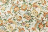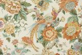P Kaufmann Sissinhurst Spice is a linen/cotton blend fabric from Spain with a large print of birds perched on flowering vines against an off-white background.