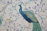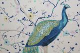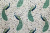 This lovely fabric features a print of various peacocks on branches with yellow and blue flowers against a cream colored background.