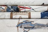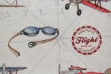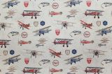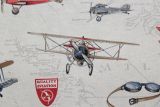 Planes Aviones fabric is a print which features various old-fashioned propeller airplanes, aviation insignias and map coordinates against an off-white background.