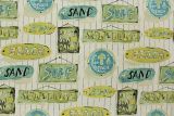 Sunshine Beach Nautical with LiveSmart is a fun and colorful woven fabric featuring a plank background adorned with various beach themed signs in colors including red, blue, cream and yellow.
