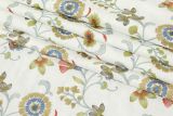 Swavelle Mill Creek Passion Flower Carnival is a woven fabric with a beautiful floral and vine pattern embroidery in colors including gold, blue, red and gray against a white background.