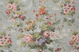 Tapestry Blue is a heavy-weight woven upholstery fabric with roses and vines in colors including blue, pink, green and red against a cream color background.