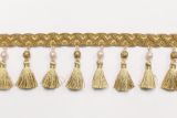 4-inch wide woven drapery and upholstery tassel fringe in with dangling beads on a detailed gimp.