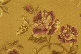 This European floral features red and gold flowers against a basket weave antique gold background.