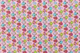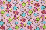 Tropical Fish Pink is a 100% cotton fabric with a print of fish in colors including blue, purple, orange, yellow and green against a pink background. Great for face masks.