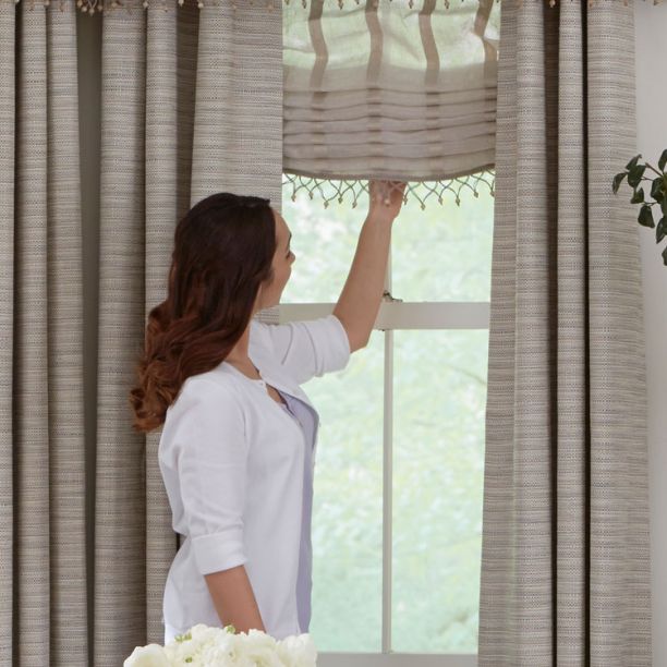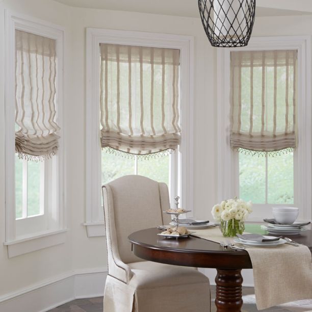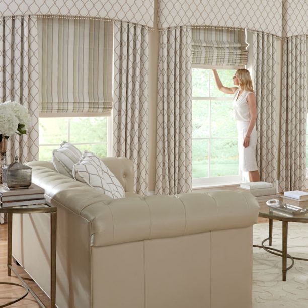Relaxed Roman Shades, custom-crafted for your space, bring a soft and refined look to your windows. As they lower, they form a smooth, flowing design that complements your room.