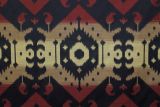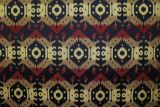 This is a gorgeous woven fabric featuring a large Ikat pattern in colors including rust, black and brown.